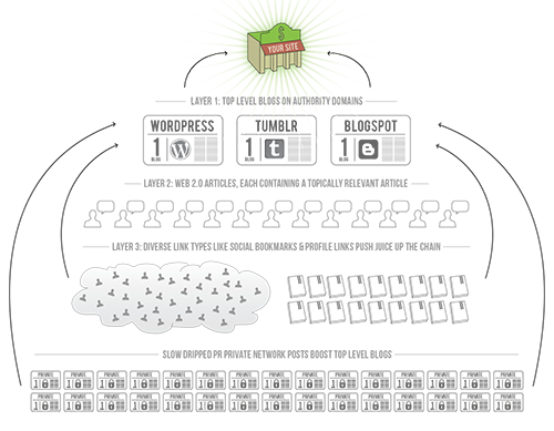 Viral Backlinking Strategy: Our second offer is our viral marketing packages. We can build backlinks in a way that will mimic the pathway of a website that has gone viral. We will create and post related articles on authority Web 2.0 properties such as but not limited to: WordPress, Blogger, and Tumblr. Each article will include video, pictures, and a backlink to your website. We will then boost the power of these Web 2.0 properites by building backlinks to them with other Web 2.0 properties, social bookmarks, and profile backlinks. But wait! The fun doesn’t stop there. We will then drip-feed your authority web 2.0 articles to our network of high PageRank blogs for 3+ weeks. See image on the left.